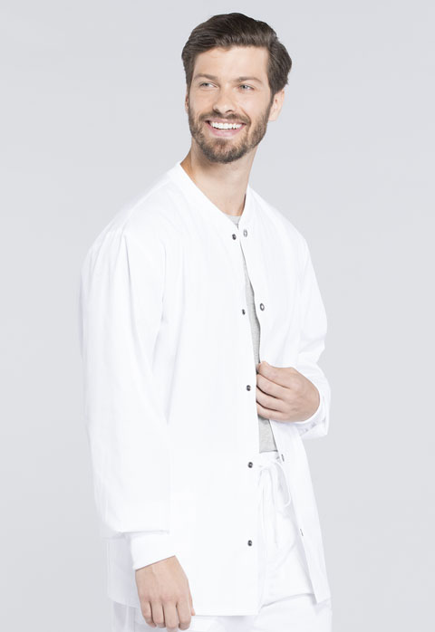 A Men's snap front warm-up jacket features a comfortable rib collar and cuffs, two patch pockets, a cellphone pocket, and back yoke. Center back length: 30"